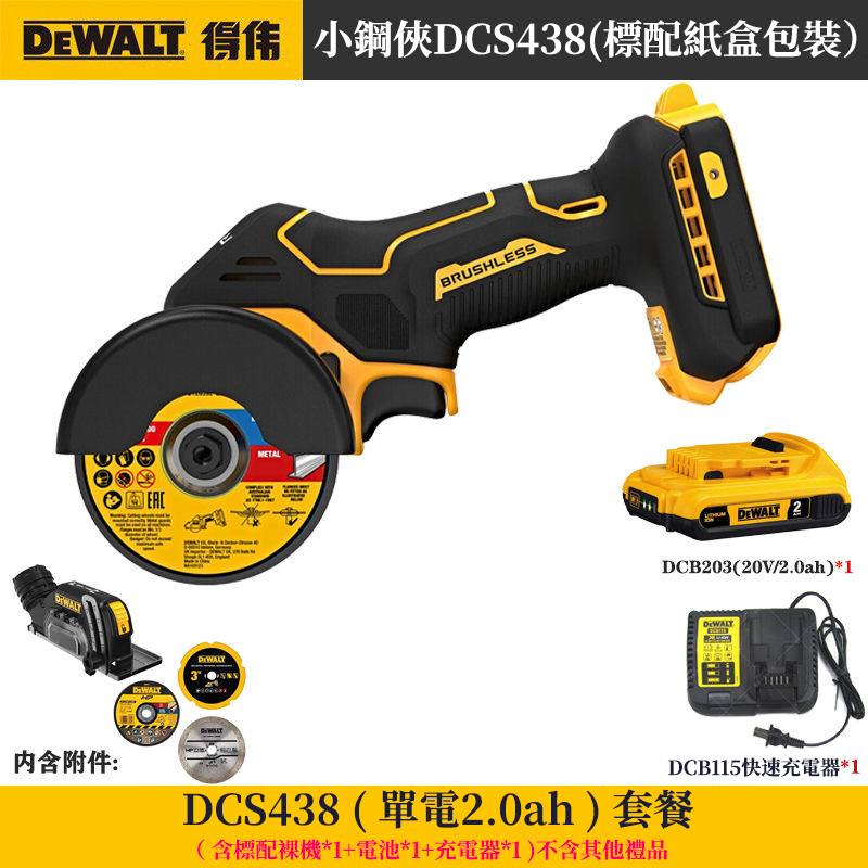 20分鐘前得偉「DeWALT」20V無刷角磨機DCS438小鋼俠 金屬、木材、水力、塑膠管、瓷磚都可切割 單手一機完成! - 小鋼炮【DCS438】一電一充