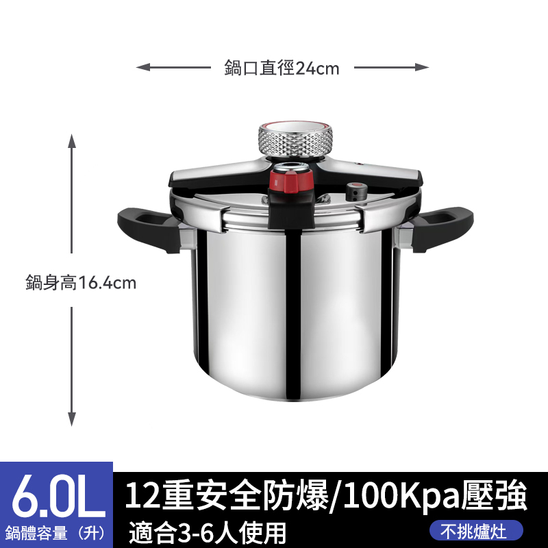 15分鐘前【年底換新大促】燃氣電磁爐通用【德國進口】304不鏽鋼壓力鍋 煮飯/熬粥/炖肉 自動限壓閥排氣保護安全防爆 耐用20年不壞 不滿意包退換 - 升級加厚 6L【適合1-4人使用】304不鏽鋼壓力鍋 NT$2680