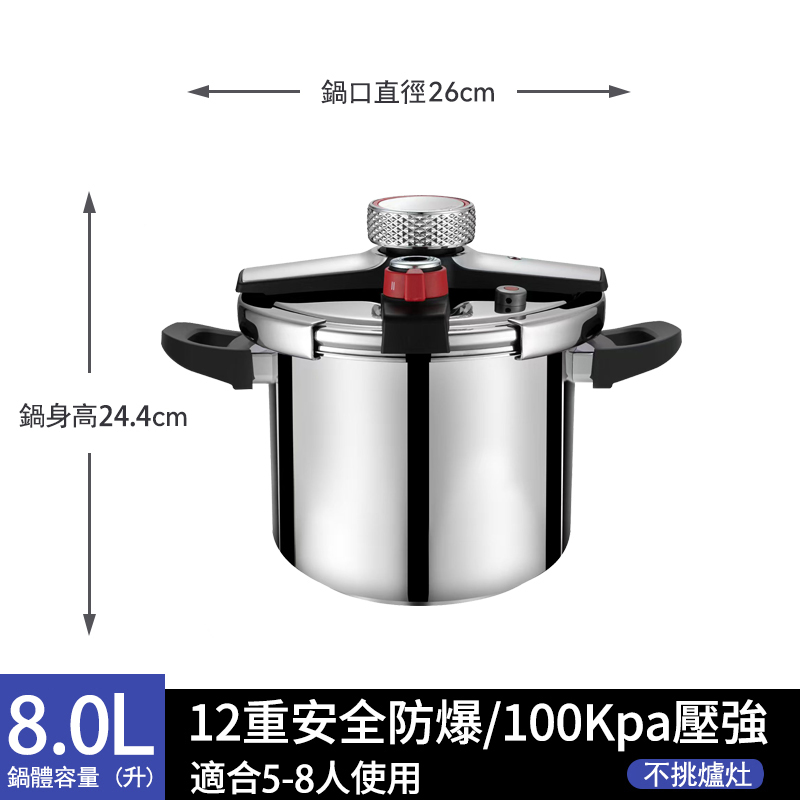 11分鐘前【年底換新大促】燃氣電磁爐通用【德國進口】304不鏽鋼壓力鍋 煮飯/熬粥/炖肉 自動限壓閥排氣保護安全防爆 耐用20年不壞 不滿意包退換 - 升級加厚 8L【適合5-8人使用】304不鏽鋼壓力鍋 NT$3080