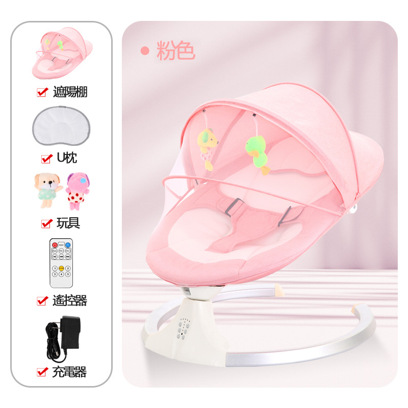 半小時前解放媽媽雙手的電動搖椅 專業仿生設計,寶寶超享受,一不小心就睡著了!日本骨科醫師認可 - (粉色)五檔調節【藍牙+遙控】遮陽蚊帳+枕頭+玩偶